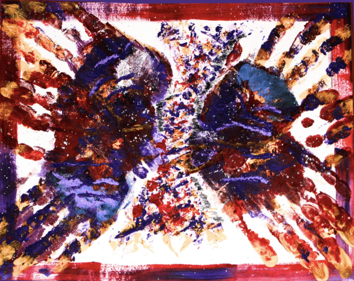 The butterfly represents transition and new beginnings. I wanted to overlap colors with my hands as a way to show how we all—every color, race, ethnicity—connect and imprint on each other, creating pictures and stories through our kinship. Converging the butterfly with these colors through abstract art (i.e., the fingerprints and short brush strokes) makes me love the butterfly more and more.